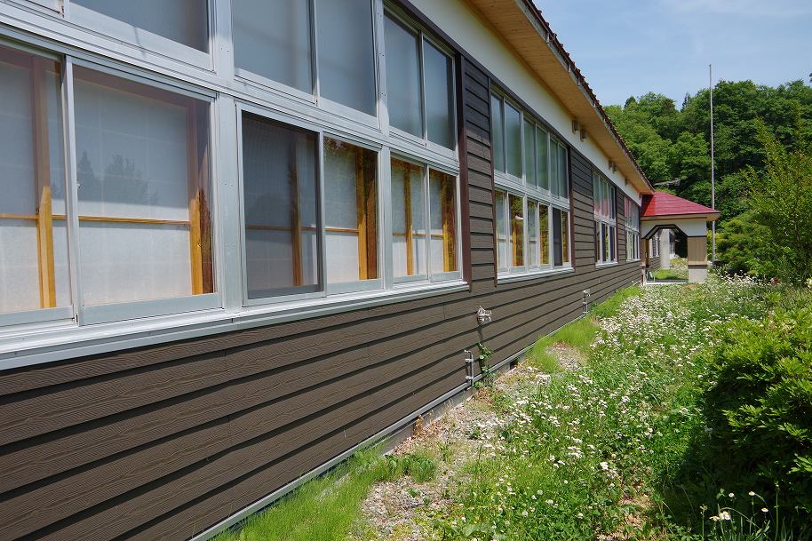 岩手県一関市に建っているながーい校舎。小さな教室が横に一列に並んで長さ119m。京都の三十三間堂とほぼ同じ長さです。夏は青い空と森の緑、赤い屋根と校庭、冬は一面真っ白。建物が、自然と一体化しています。長い校舎の外観は、3回にわたる改修の痕跡が建物に刻まれています